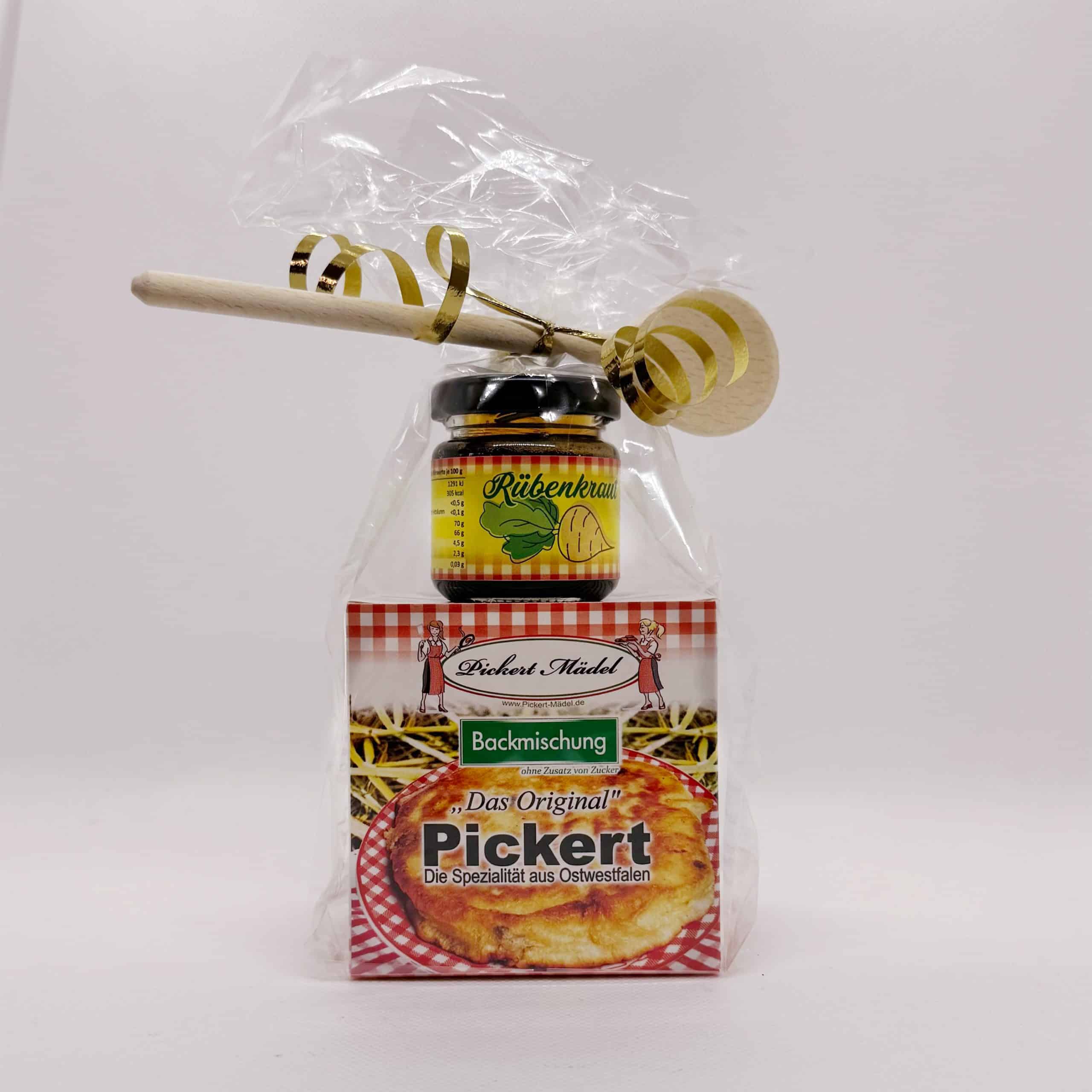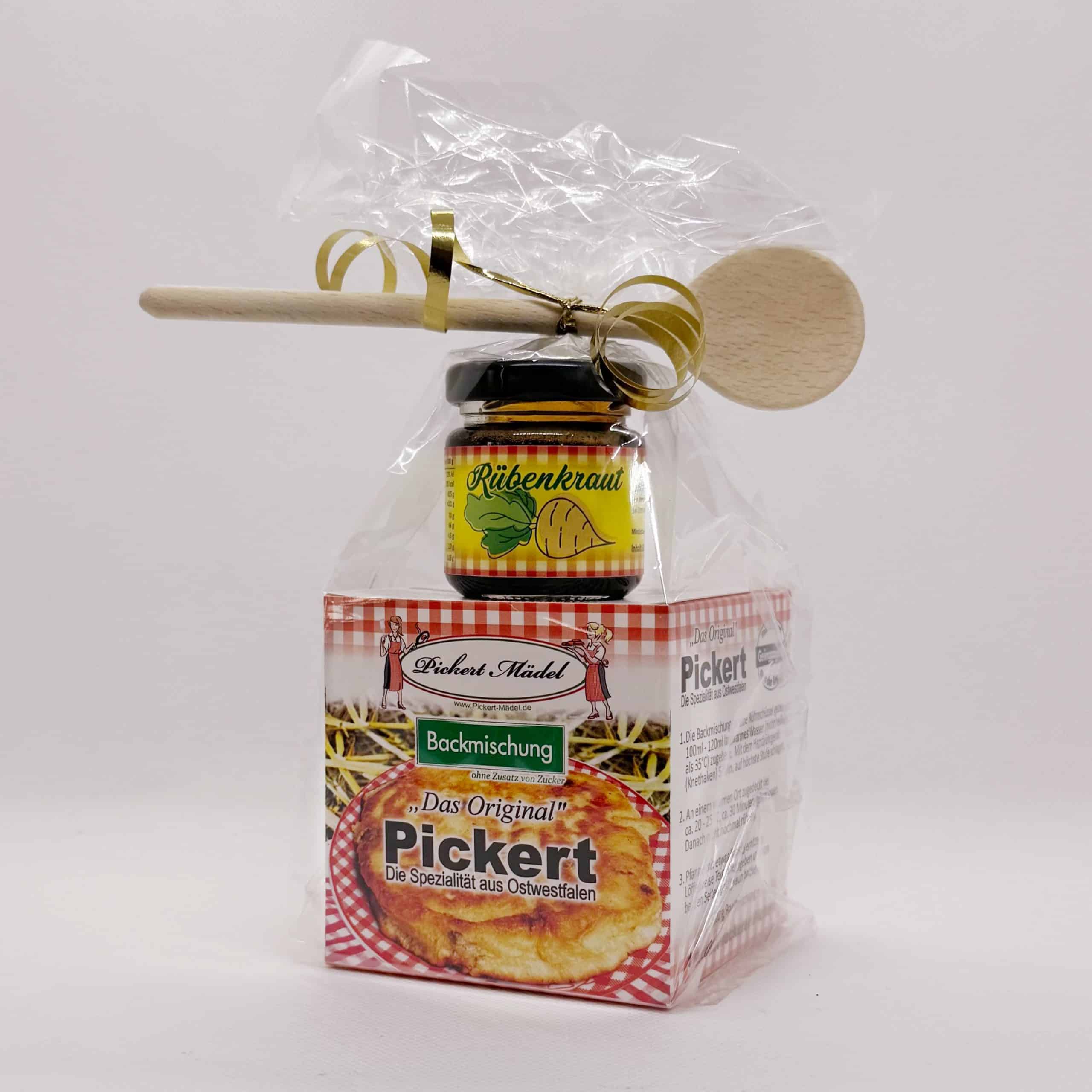 Pickert-Präsentbox, 100g Backmischung mit Rübenkraut und Holzlöffel in Cellophantüte